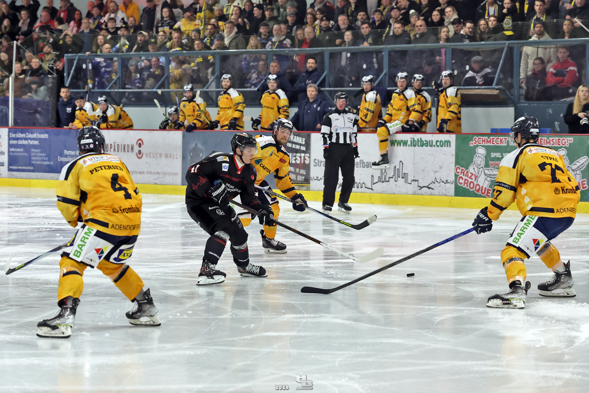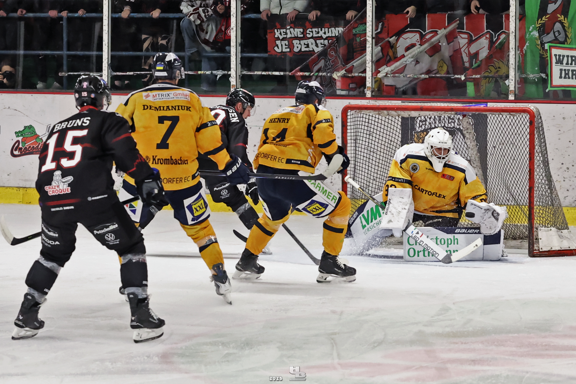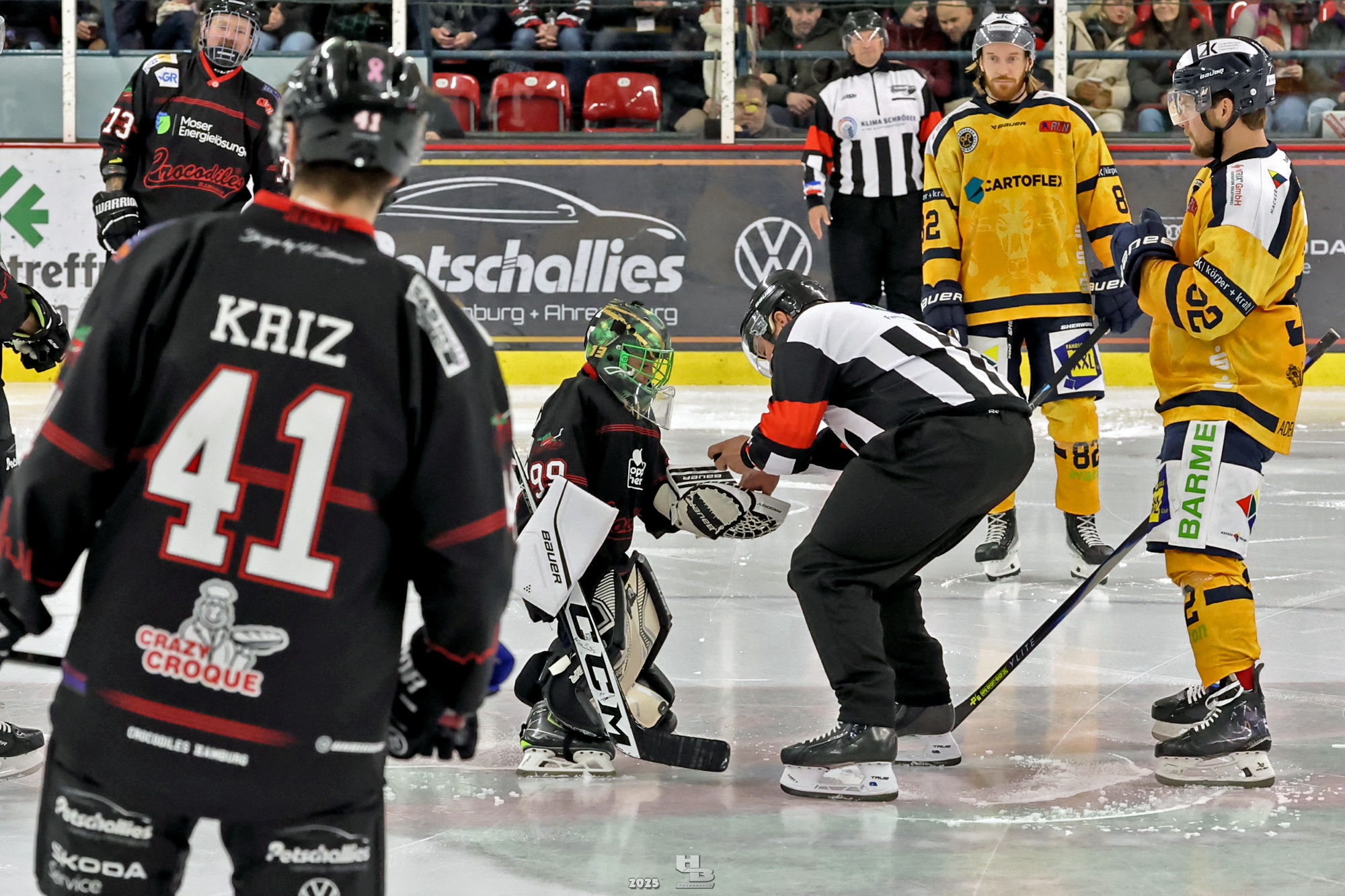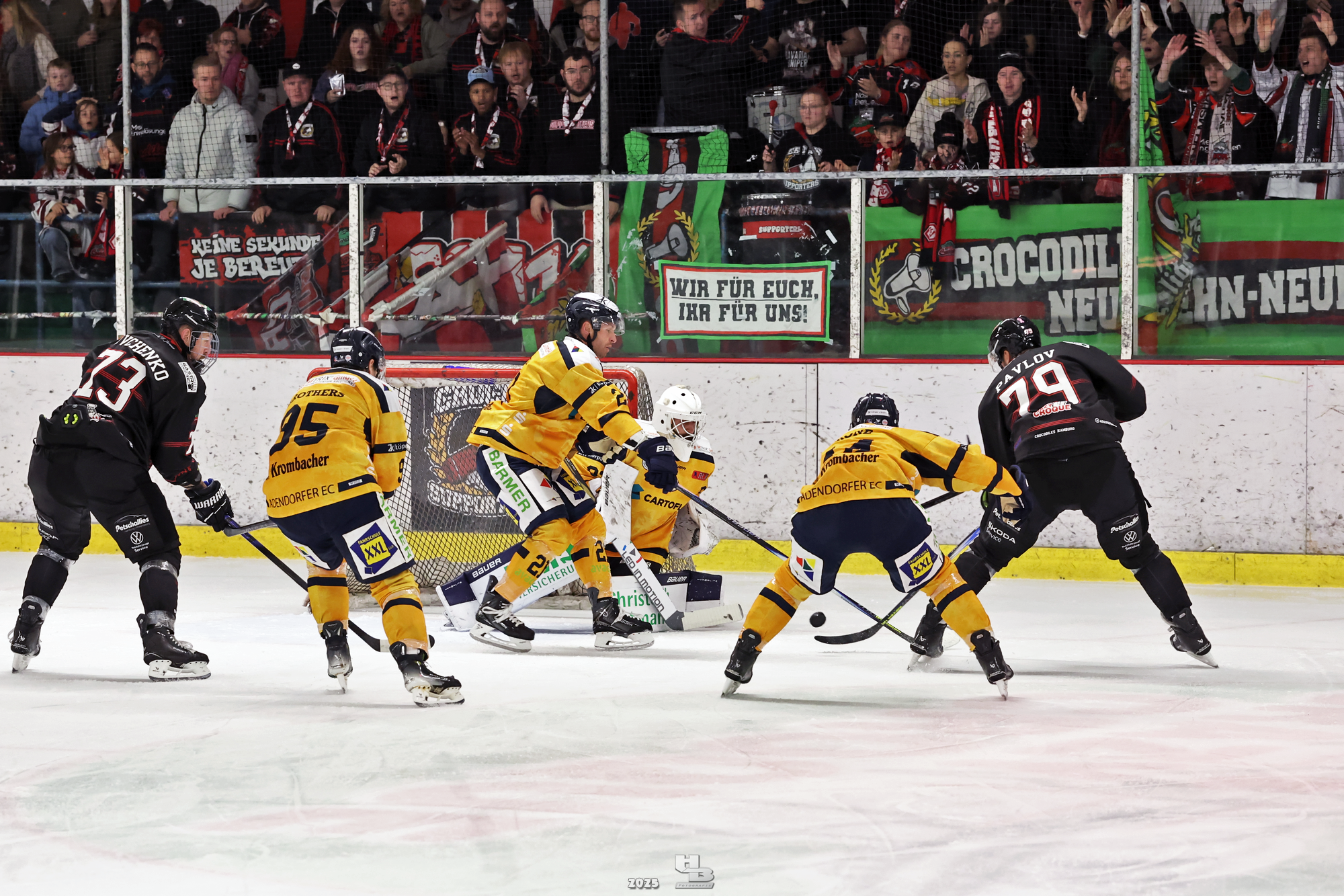 Die Crocodiles machten früh Druck auf das Gehäuse der Adendorfer. Man merkte, dass sie nach dem Sieg gegen die Falken weiter Vollgas geben wollten. So kam es, dass Leo Prüßner in der 4. Minute auf Traumvorlage von Markus Lepistö und Tobias Bruns das 1:0 erzielte. Die Crocodiles erhöhten weiter den Druck. In der 17. Minute musste Domantas Cypas für zwei Minuten auf die Strafbank. Das folgende Powerplay blieb ohne Treffer, sodass es mit der knappen Führung in die erste Pause ging.