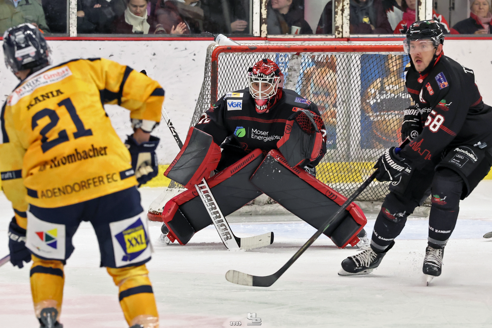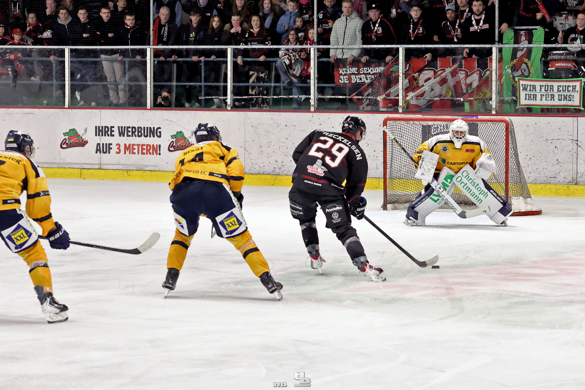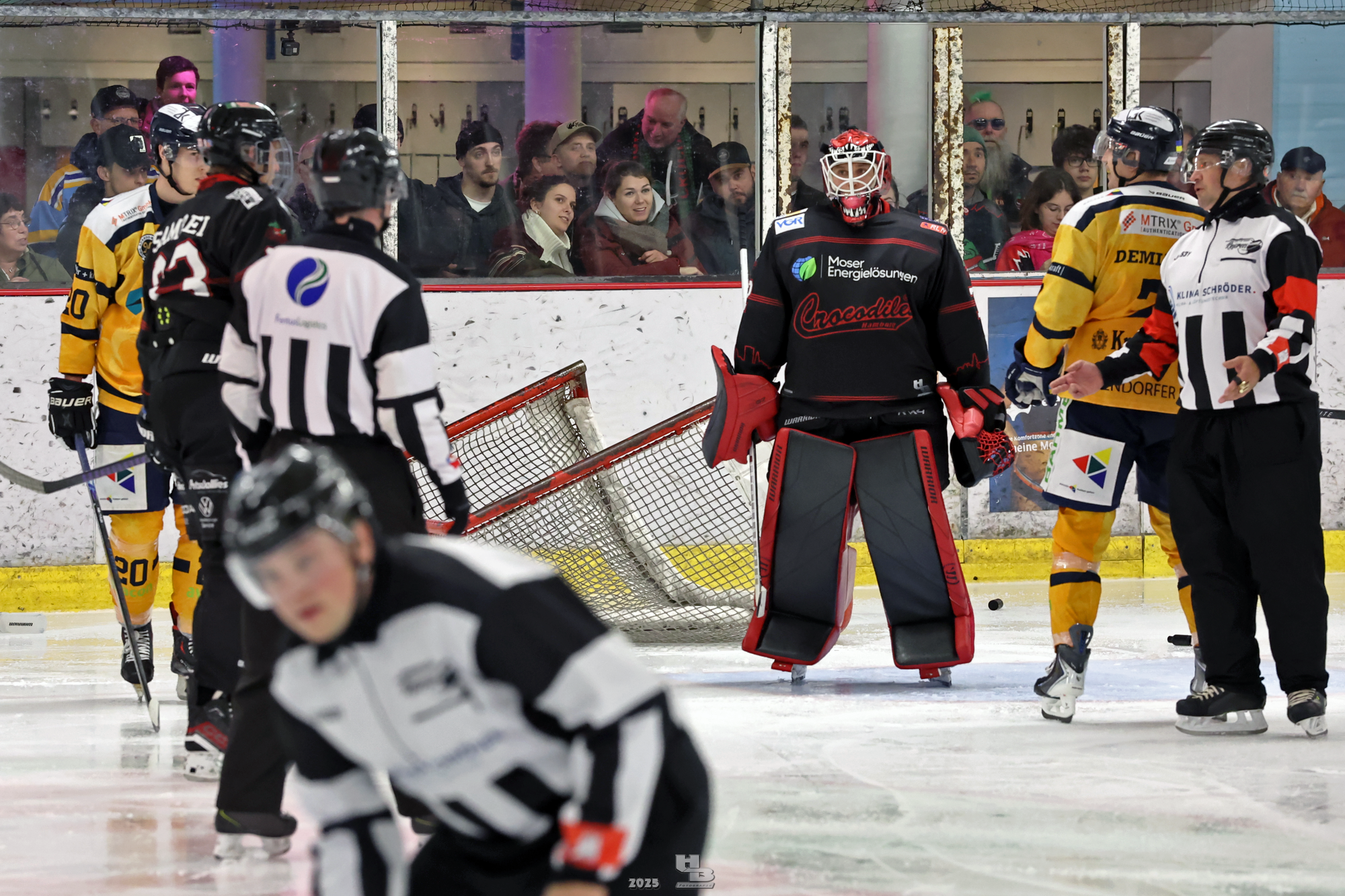 Nach der Pause hielten die Crocodiles das Tempo hoch, sodass Lasse Spreckelsen in der 24. Minute auf Vorlage von Maksym Andriienko und Oskar Siradze zum 2:0 erhöhen konnte. Dann ließen die Crocodiles das Tempo nach, sodass die Adendorfer einen guten Konter starten und durch Andre Gerartz auf 2:1 verkürzen konnten. Von da an kamen die Adendorfer nach und nach dem Tor immer näher. Die Crocodiles hatten noch drei Mal die Chance, im Powerplay ein Tor zu erzielen, doch jedes Mal scheiterten sie am starken David Kovacs. Mit der knappen 2:1-Führung ging es in die zweite Pause des Abends.